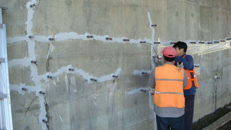 該地下停車場頂板、立壁、沉降縫等處滲水,經(jīng)多次維修均未達到預(yù)期目的,甚至愈加嚴重。根據(jù)承建方提供的資料與現(xiàn)場勘察情況,技術(shù)人員結(jié)合多年維修經(jīng)驗,采用公司好的材料進行注漿止水施工,經(jīng)過兩個多月緊張、有序地施工,滲漏水問題得到徹底解決。承建方對開來公司的施工效果給予高度地評價。